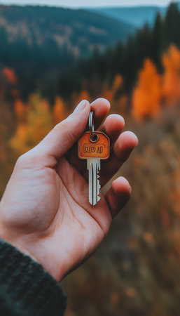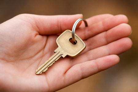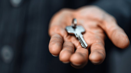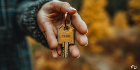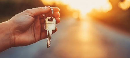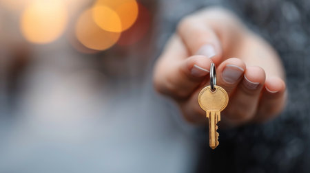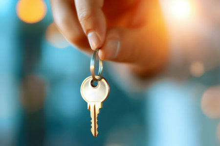 Closeup shows a hand gripping a key on an elegant keychain, symbolizing security, ownership, and new beginnings, set against a vibrant bokeh background