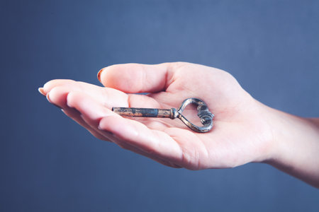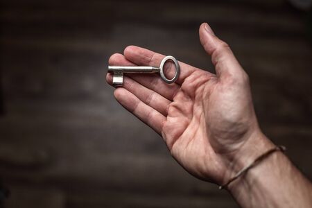 Vintage key held in hand, showcasing intricate designs and unique shape. key metallic finish reflects light, adding sense of nostalgia and mystery to image
