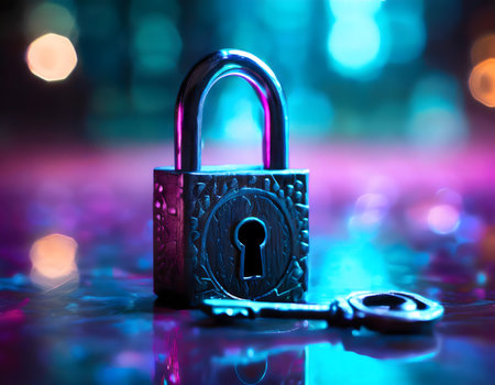 A close-up view of a colorful padlock placed on a vibrant blue and yellow background. This image symbolizes security, protection, and privacy in modern design.