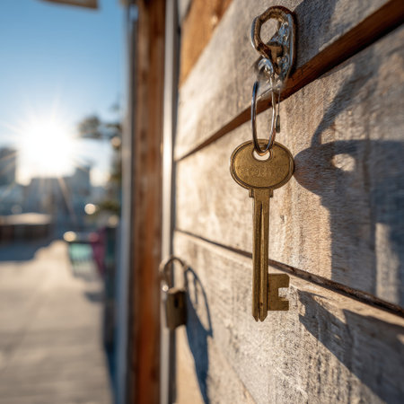 A single key hangs from a wooden door, with a sunlit city blurred in the background