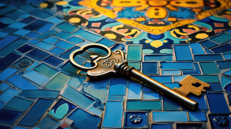 A single shiny metal key lies on a textured blue surface, showing its design and intricate details in the soft light, creating an artistic and captivating display.
