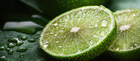 Macro texture of fresh ripe lime slices with water drops, close up view. AI generated.