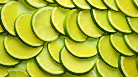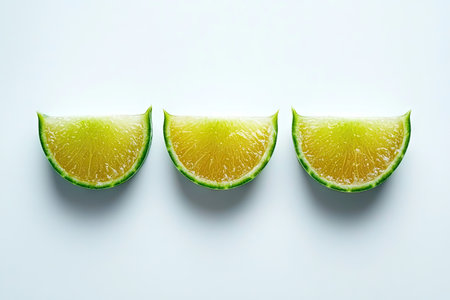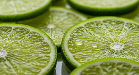 This close-up image showcases several freshly cut lime slices, revealing the internal structure and vibrant green color. The composition highlights the texture and detail of the fruit, enhanced by bright lighting. Ideal for illustrating culinary themes, health and wellness concepts, or diverse editorial content.