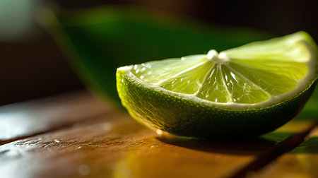 A vibrant lime wedge displays its juicy green flesh, ready to enhance drinks and dishes. Fresh and zesty, it symbolizes tropical flavors and culinary creativity.
