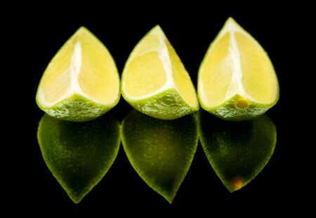 Three symmetrical segments of a lime, showcasing the vibrant yellow interior and vibrant green rind, displayed against a plain white background. The segments are arranged in a horizontal row, emphasizing their shape and detail.