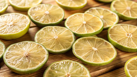 lime slices on wooden table. Detox diet, limes Backgrounds, Close up shot, fruit macro photography