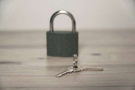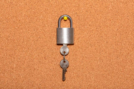 Closed padlock with keys hanging from it on an empty corkwood notice board in business office. Safety and security reminder, business closure, business for sale concepts.