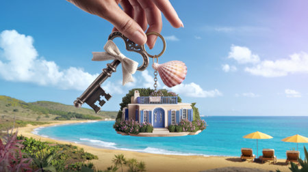 A creative image featuring a hand holding a keychain that includes a miniature house and a seashell, set against a stunning beach backdrop. This visual symbolizes the dream of coastal living and vacation homes