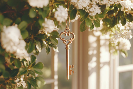 Elegant golden key hanging amidst soft floral decor and natural light