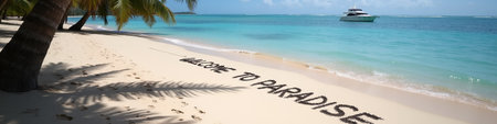 tropical beach banner, palm tree sand and ocean, vacation concept