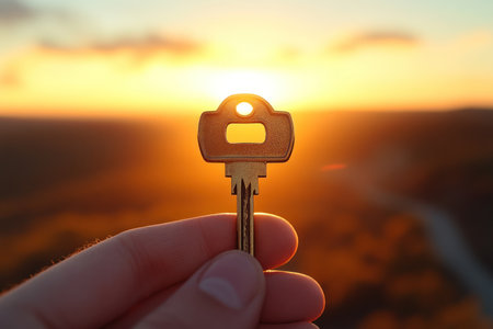 A hand grips a golden key while a vibrant sunset creates a serene background.