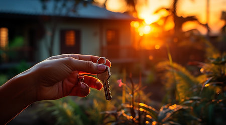 Close-up of a hand holding a golden key with a house in the background illuminated by the sunset. Concepts of new beginnings, home ownership, and real estate opportunities.