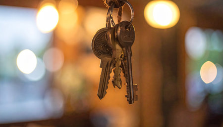 Close up of bunch of keys on blurred bokeh background.