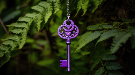 A single key dangles from a ring, showing its colorful design. The backdrop features a beautiful blur of colors, creating a dreamy atmosphere.