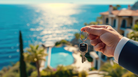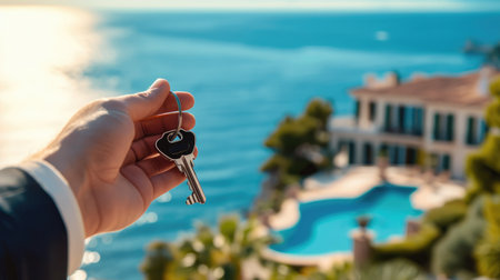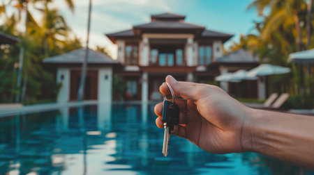 Real estate agent, home keys in a hand on background of villa or house with big pool surrounded by the sea and palm trees. Buy or rent a villa on ocean coast, removal to tropical country