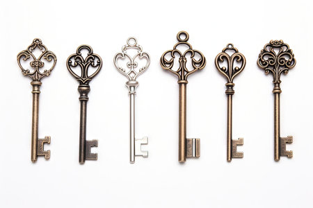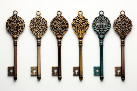 An AI generated illustration of a collection of vintage keys arranged on a white table