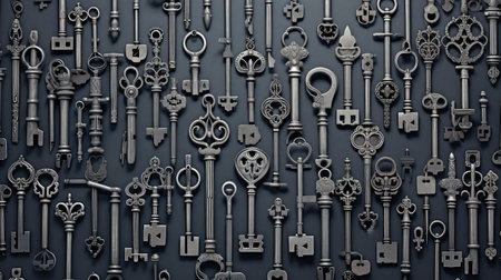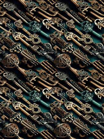 A stunning arrangement of vintage decorative keys featuring intricate designs and craftsmanship. Ideal for creative projects, artistic inspiration, and vintage decor.