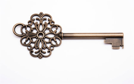 A single ornate key is featured, showcasing intricate design and signs of age on a plain, light surface