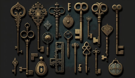 An AI generated illustration of numerous vintage keys of various shapes and sizes on a dark surface