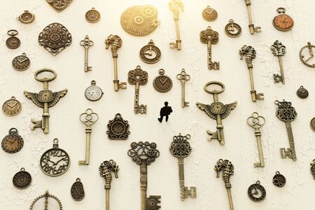surreal concept image of person looking at many vintage keys and clocks