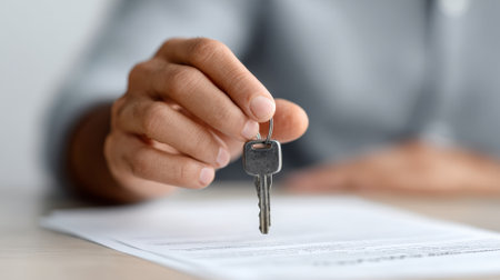 Real estate agent holding keys above a signed contract, celebrating the successful agreement for purchasing or renting a new home, symbolizes a significant step in homeownership