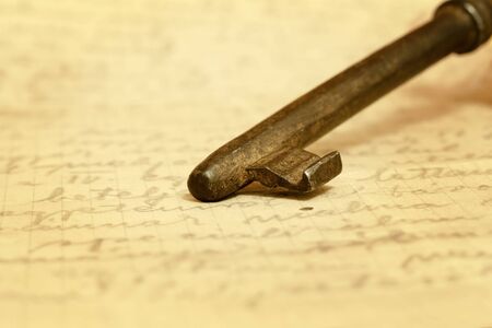 Conceptual photo of old vintage and rusty metallic key on the blue background with copy space.