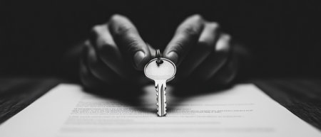 A close-up of hands holding a key above an important document, symbolizing access and decisions.