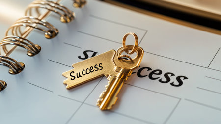 A close-up of a golden key placed on a notebook with the word Success elegantly written. This image captures the essence of unlocking potential and achieving goals.