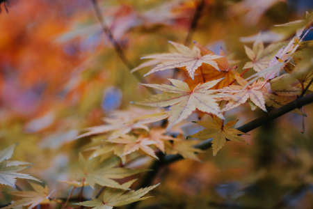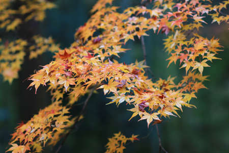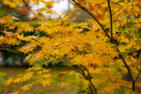 Branches of golden leaves of maple trees in a japanese garden, close up image on blurry background, selective focus
