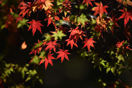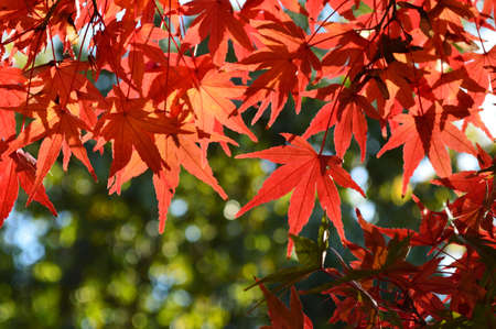Blurred defocusd bokeh image of fall season. Orange and red maple tree autumn background. Selective focus