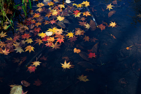 koi fish swim on pond with floating autumn red maple leaf in Nanzen-ji temple, Kyoto, Japan. Famous travel destination at fall season in Kansai.