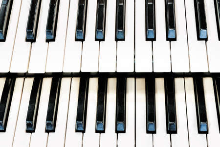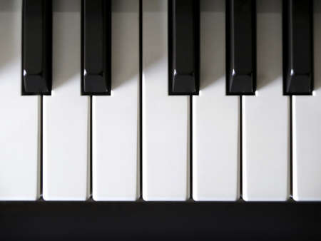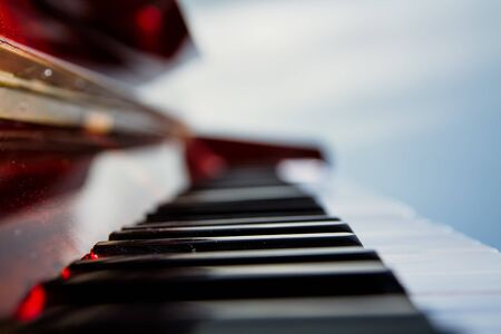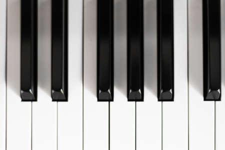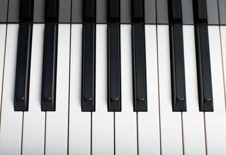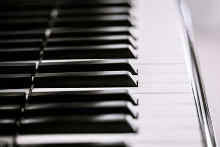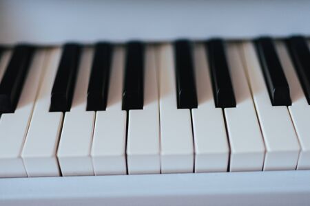 Side view of piano keys. Close-up of piano keys. Close frontal view. Piano keyboard with selective focus. Diagonal view. Piano keyboard perspective