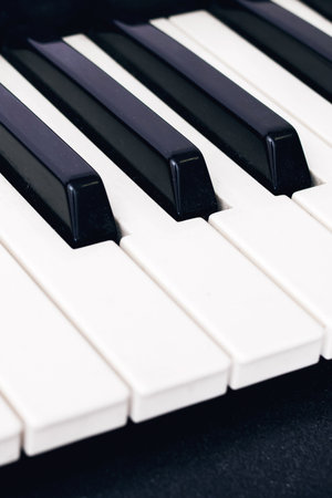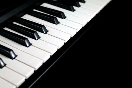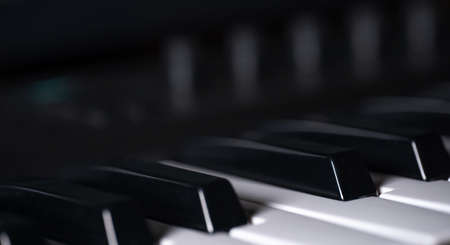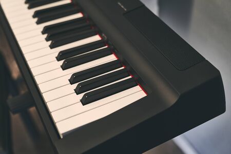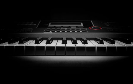 Close-up of an electronic piano keyboard on a black background. Keyboard instrument.