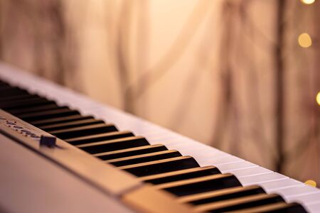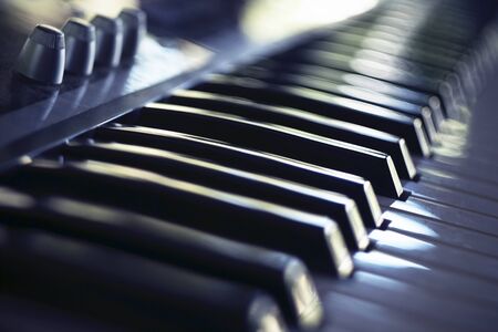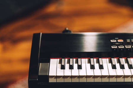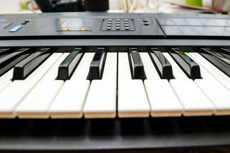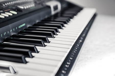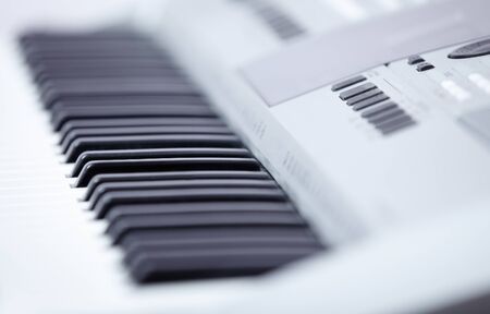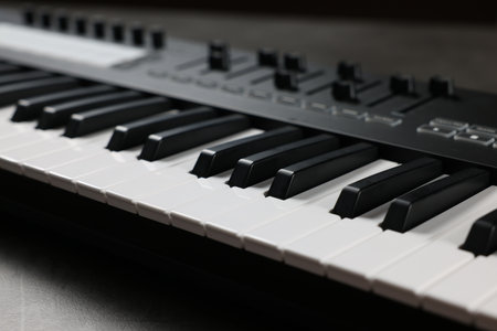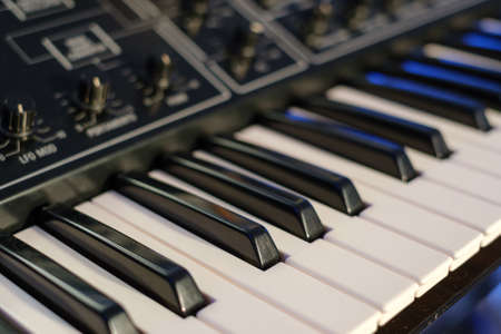 Electronic musical keyboard synthesizer close-up view. piano for recording music in a studio.