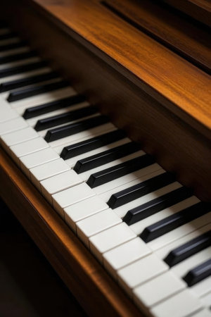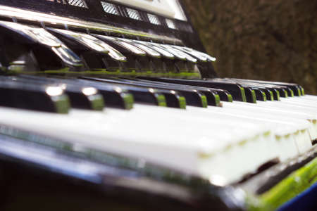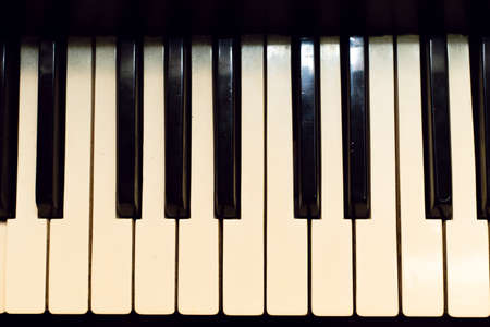 Piano keys on a wooden piano. Close-up. Selective focus.