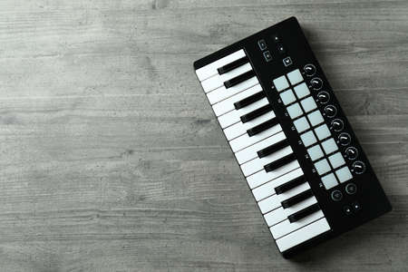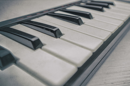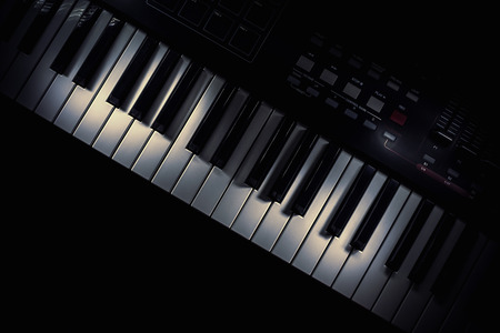 Electronic musical keyboard synthesizer with white and black keys in recording studio. With copy space.