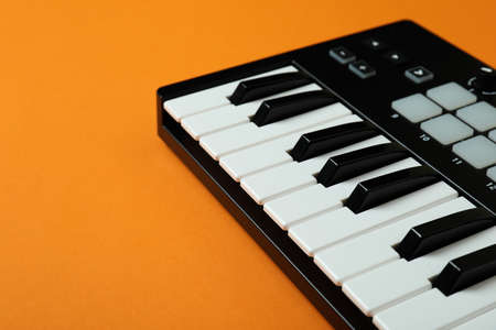 Close up image midi electronic musical keyboard, modern device, horizontal image selective focus, no people