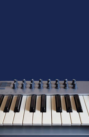 Electronic synthesizer keyboard with many control knobs on blue background with free space for text on top