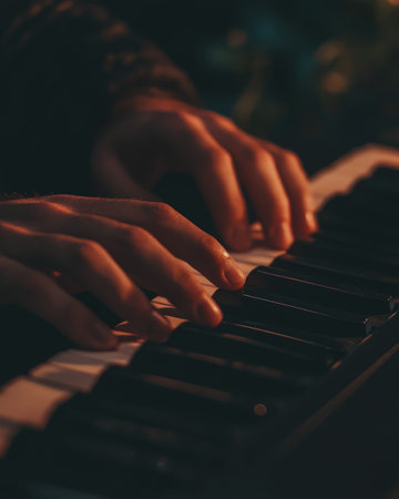 Synthesizer keys with selective focus and hand in the background, synth playing