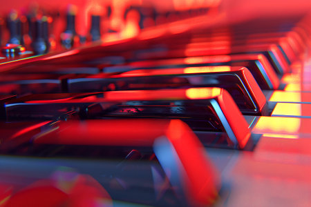 Close-up of piano keys with colorful neon lighting, artistic music instrument concept