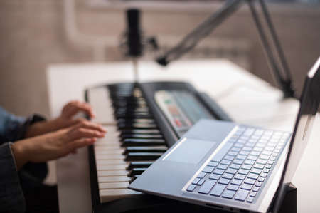 Close-up of female hands on the electric piano. A woman is learning to play the synthesizer on a laptop
