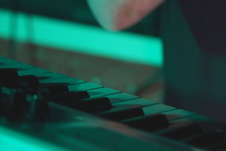 Part of the keyboard of a synthesizer standing on the stage during a performance. Selective focus