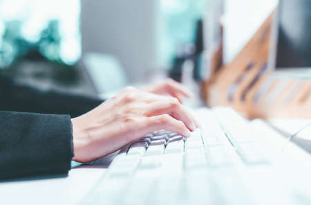 Businesswoman working with computer and typing text on keyboard at modern office