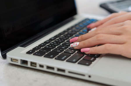 Young womans hands type fast on laptops computer keyboard. Girl writes communication message email letter