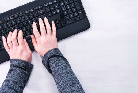 Top view of hands typing on Keyboard, working on table.