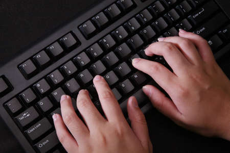 Hands typing on black keyboard, close up