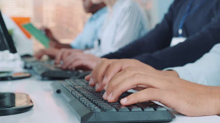 Close-up shot of operators hands typing on keyboard in modern office. People are busy working on the computer.