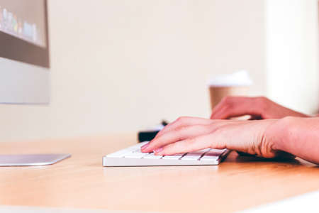 Cropped shot of female employee typing on computer keyboard on minimal office desk with schedule book and mug