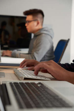 Hands of man typing on a computer keyboard in a class