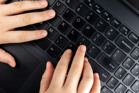 Young girl is typing on the keyboard. Risky behavior of children in internet.